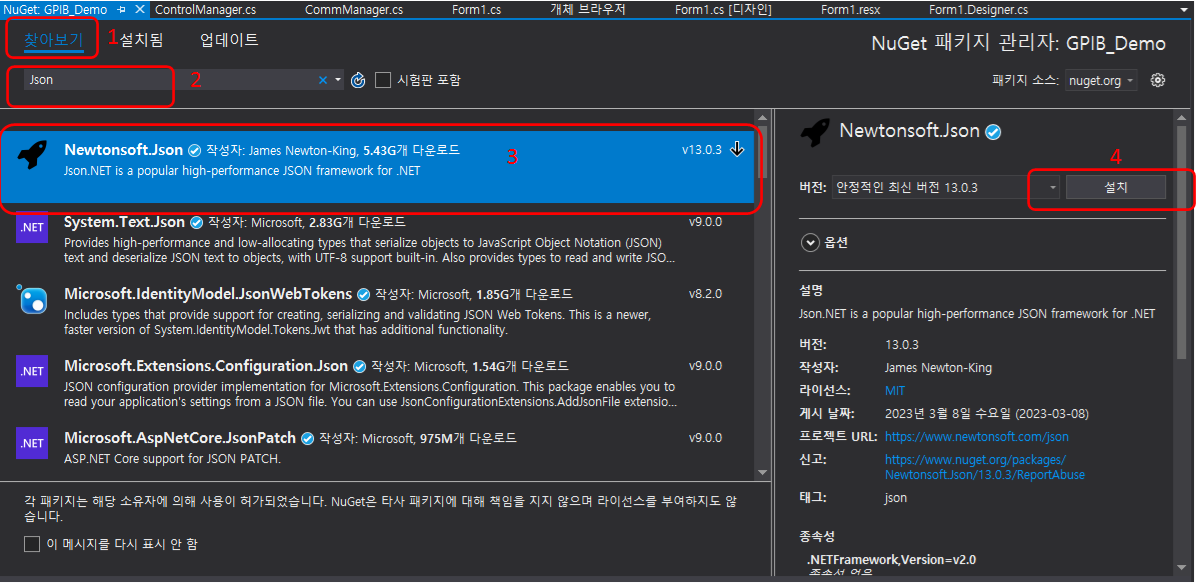 [찾아보기] => [검색란에 Json입력] => [Newtonsoft.Json 검색됨] => [우측에 상세 정보란에 설치 클릭]