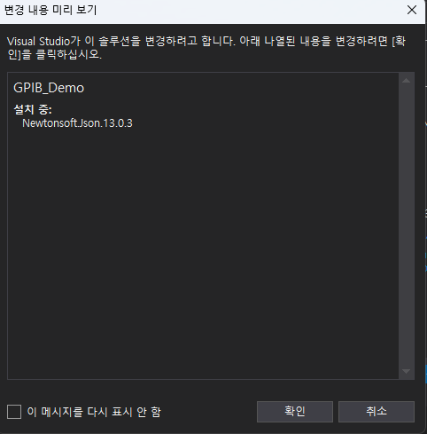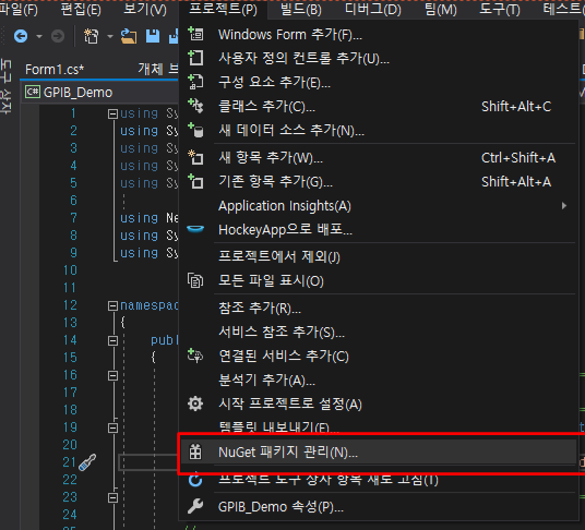메뉴에서 프로젝트=>Nuget 패키지 관리로 가서 실행을 하시면 됩니다.