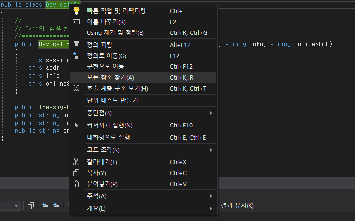 해당 변수명 메서드명 등 다른 클래스에서 참고가 되는 부분을 선택하고 우클릭하면 [모든 참조 찾기]가 나옵니다.