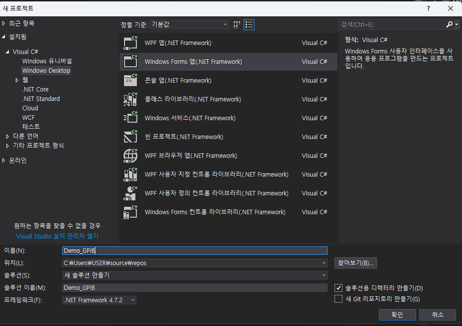 2. Windows Form(.NET Framework)선택한다.