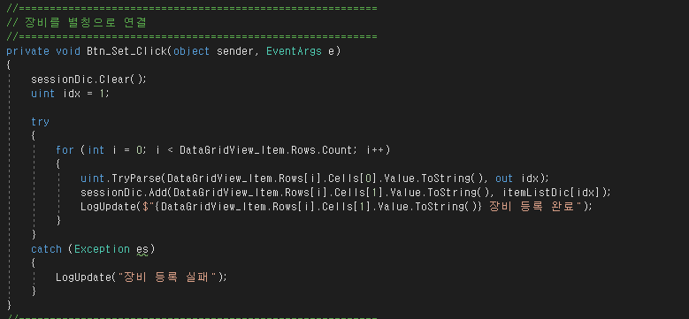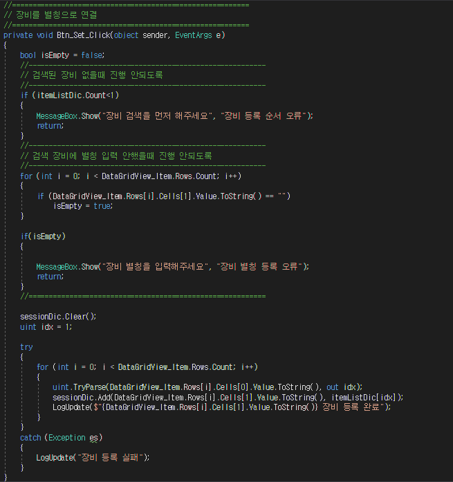 장비 연결시 에러가 날 수 있으므로 Try~ Catch를 사용하여 런타임 오류에 대한 대비도 하였습니다.