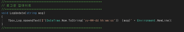 처음에 파라미터 입력부를 안만들었는데 각 메서드에서 사용자에게 보여줄 내용을 전달해야 하니 [ string msg ] 라는 파라미터를 만들고 로그의 표현방식은 [시간정보와 메세지]를 보여주도록 하였습니다.