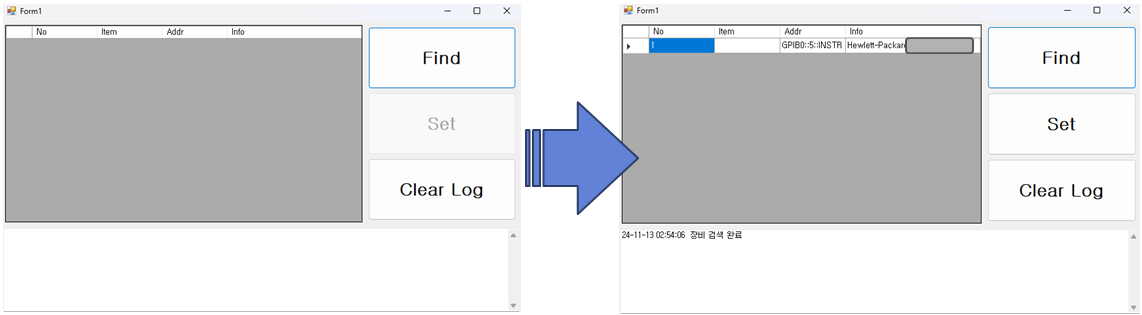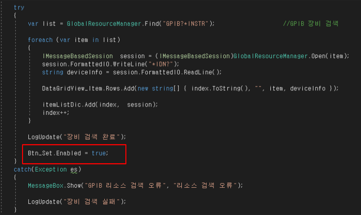 Find 버튼 클릭시 수행하는 코드에 장비 검색이 되면 Set버튼을 활성화하는 코드를 작성하였습니다.