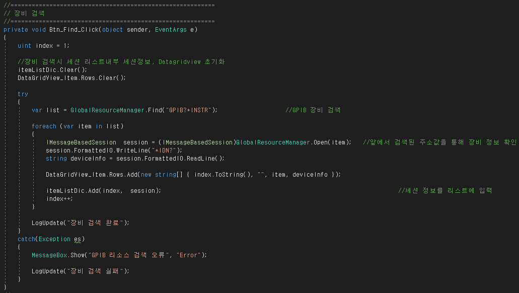 인덱스, 딕셔너리, DataGridView 각각 초기화를 진행하고 GlobalResourceManager를 통해 GPIB 장비만 검색을 하고 주소값을 통해 세션을 열어 [ "*IDN?" ] 명령어를 통해 장비의 정보를 받아와서 DataGridView 도구에 표현하고 인덱스와 세션 정보를 딕셔너리에 담았습니다.