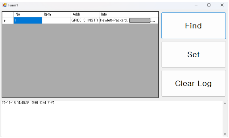프로그램을 띄우고 장비를 검색하면 DataGridView 도구에 행이 추가되고 검색 장비가 나타납니다.